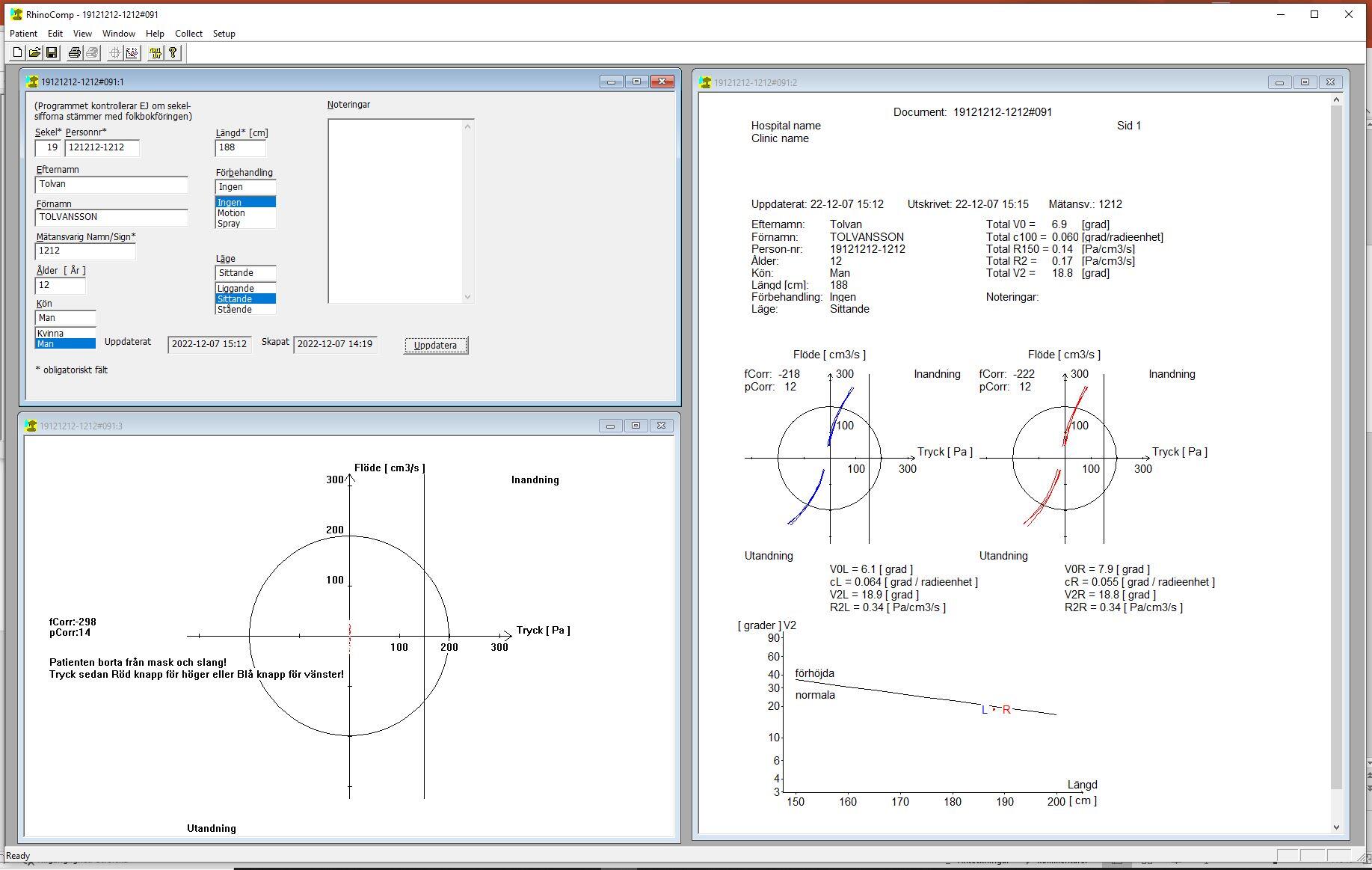 För totalnäsan erhålles också R150 (motståndet vid 150 Pa). Som beslutsstöd indikeras respektive näsborres V2 som funktion av patientens längd, i ett diagram med jämförelsekurva baserad på ***.